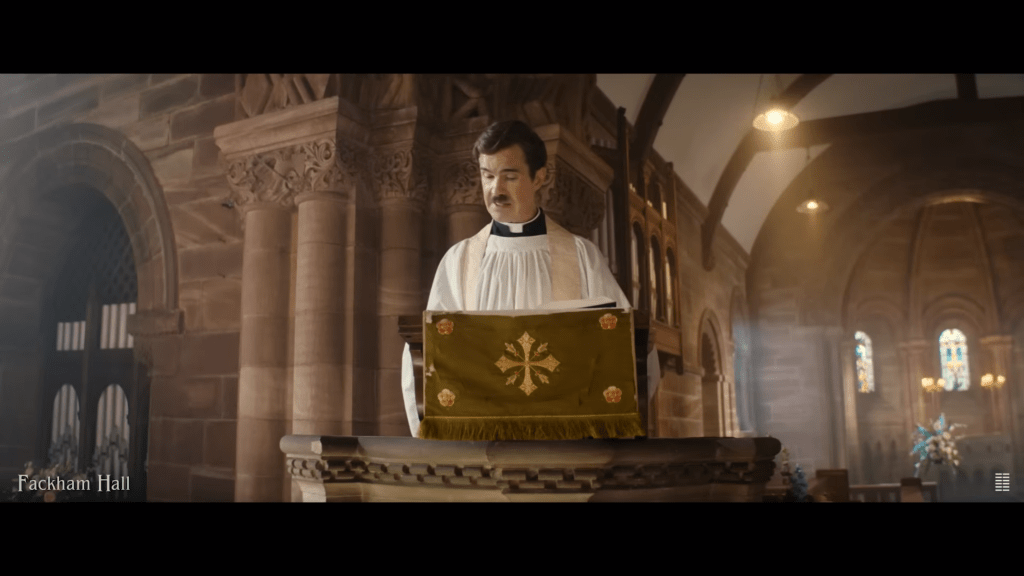 Among the reasons why I was looking forward to this film, one of them is the the fact that comedian Jimmy Carr is attached to the project. If you know me, you would be aware that Jimmy Carr is one of my all time favorite comedians. I watch his specials on YouTube on a regular basis. I have seen him a few times when he’s performed in New England. I also like him as a game show host. In fact, he is one of the film’s five writers, making this his first screenplay. Carr also has a small role in the film as a vicar. He is only on screen for one to two minutes, but he plays his part to the best of his ability. This is not to say he did a bad job, but he played a character who basically has one running joke, specifically that he says things that sound taboo or wrong, only for him to pause and finish the rest of what he has to say. On paper, the joke is funny. But I have seen the trailer for this film and as someone who was looking forward to seeing Jimmy Carr on screen, I wish he had some variety in his material.