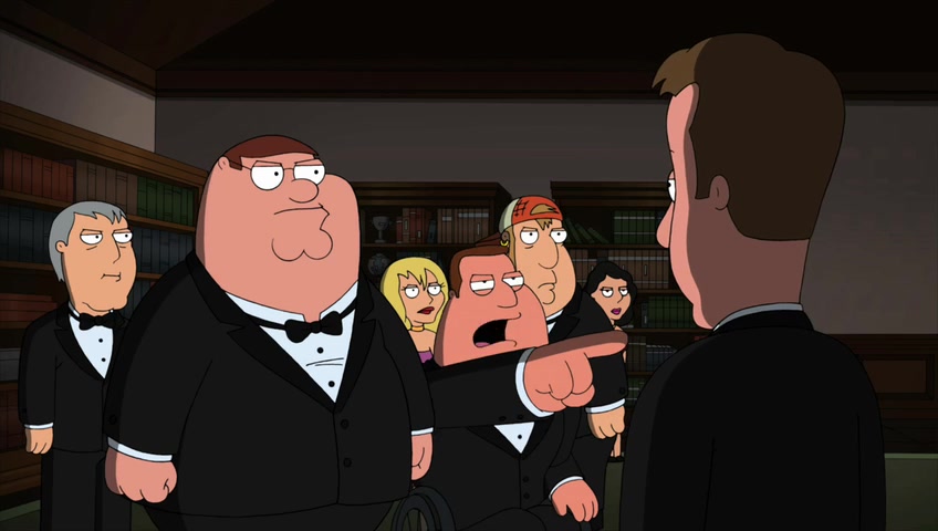 Everyone flies back into the mansion, gathers together in a room. Lois assumes Priscilla’s up to this, then Consuela discovers James Woods’ Golden Globe is missing. Everyone gathers around Joe, who suggests that if anyone leaves the group, they’re assumed to be the killer. They investigate Glenn Quagmire’s room, which doesn’t have anything of note. Although Stephanie’s huge underpants get some screentime, which provides for some funny lines.