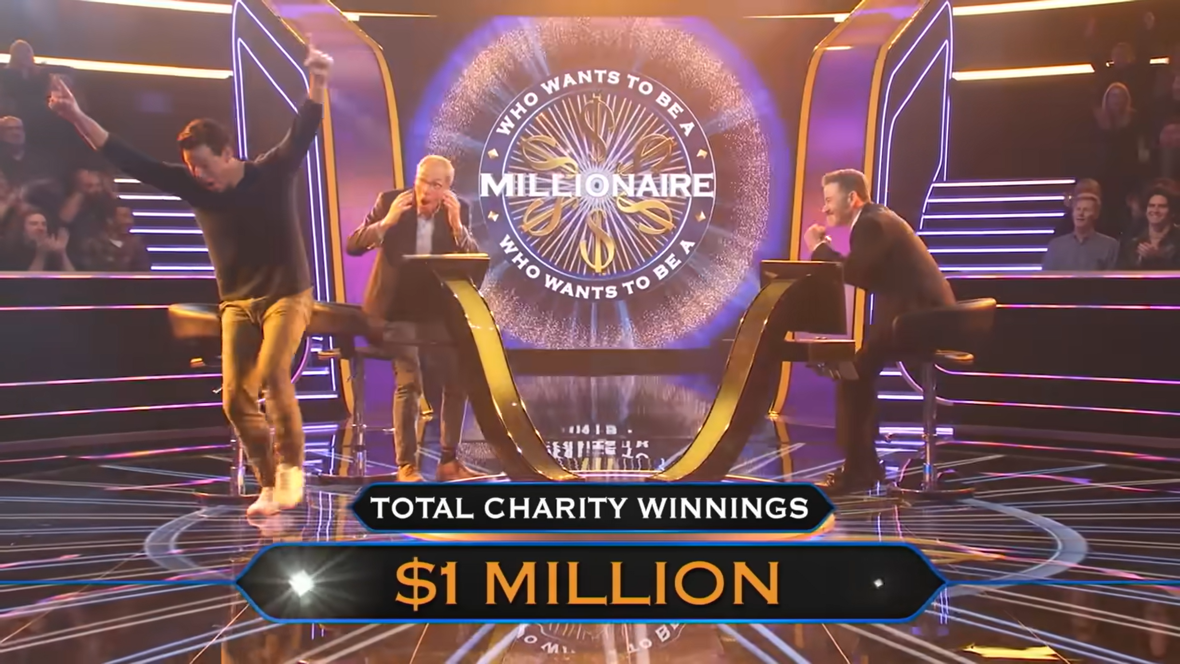 Heck, during Jimmy Kimmel’s second season, that actually happened when celebrity contestant David Chang won! The player became the first celebrity in history to win the million, which was acknowledged on air. He and Jimmy celebrated with elbow bumps. The sideline expert joined in. They paused for a moment to breathe, and then they sit down and discuss how everyone felt in the moment. They even took time to call David Chang’s phone a friend, ESPN’s Mina Kimes, to bring her in on the celebration. In fact, you can see this for yourself in the full episode, which as of this post’s publication, you can watch on YouTube. The million dollar question begins around the 17 minute mark. You’re welcome.